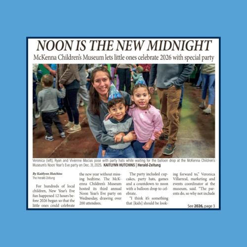 Posted on January 2, 2026Herald-Zeitung: McKenna Children’s Museum lets little ones celebrate 2026 with special party The McKenna Children’s Museum hosted its third annual Noon Year’s Eve party, drawing over 200 attendees. Read the full story here.